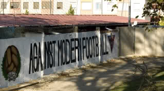 It's fair to say that British football culture plays an important role in the outlook of Ceares' fans and this can be seen and heard from the moment you enter the ground. The entrance is adorned with a sign reading Esto Ye La Cruz (This is La Cruz in Asturian). The walls around the ground are decorated with murals, many of which are in English and the biggest of which reads Against Modern Football. Most of the music played on match days originates from British punk bands and there are even a few chants with English.